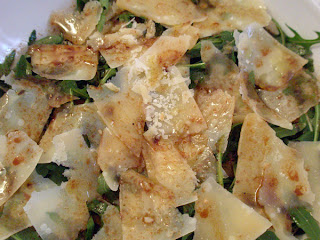 La vida pasa, las familias modifican sus estructuras y las nuevas citas de unos y otros hacen que aquello que antes se preparaba (años y años de tradición) para San Esteban, se tome ahora el día de Año Nuevo y aquello que antes se tomaba por Navidad, deje ahora de tomarse (¡los análisis de sangre mandan!), y etc. En mi caso, este año los canelones, que según los cánones, tenían que llegar por san Esteban, han tocado para el día de Año Nuevo. ¡Bien está, mientras lleguen! Como entrante, se tomó una de las ensaladas que más me gustan. En la foto la tenéis: sobre un fondo de rúcula (entre ácida y picante), unas finísimas láminas de pera "conference" (dulce y granulada) y encima, unas virutas de parmiggiano reggiano. El bocado que produce, con la ayuda de la vinagreta, esa combinación, es delicioso y estimulante.