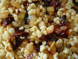 El otro día sobró bastante trigo de la cena de los niños (cocinado por exceso de agua). Y a mí me encanta la cocina con las sobras, abrir la despensa e inspirarme. Así que hice lo siguiente: en una cazuela, sofreí una cebolleta, con su sal y algo de orégano de Béjar; cuando estaba en su punto, añadí un poco de nabo negro y un puerro, todo finamente cortado y cuando estuvo en su punto, añadí unos trocitos de tomate deshidratado, para que cogieran volumen con el jugo de las verduras y un poquitín de agua que añadí. Tras rectificar de sal, eché el trigo, dejé que se impregnara en la cazuela con los sabores del sofrito y las verduras, de paso se calentara debidamente (la foto muestra cómo quedó), y a comer.