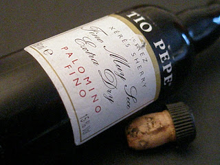 La "sorpresa" saltó, cuando entre tanta mediocridad y perdido en la zona de destilados, topé con un "Fino Tío Pepe" (entre un Brandy Lepanto y un Anís dulce: sic!). Recordé de inmediato uno de los últimos comentarios de Encantadísimo, cuyo protagonista era una inusual botella de este estupendo fino, en un formato (botella verde traslúcida) de exportación, pero no de consumo en España. Pues he aquí que a mí me sirvieron el botellín que véis en la foto (de 50 ml), en una copa (la única decente de todo el servicio, pues el vino lo sirven en una especie de vasos troncocónicos) casi apta para el consumo de fino. Mantenía sus características habituales, aunque con un ligero verdor en ese amarillo pálido brillante, que no sé a qué atribuir: estaba muy seco en boca, como es habitual, con aromas de hueso de aceituna, de la misma aceituna en salmuera, con su punto de salnitre y de almendras saladas. Un trago mínimo, sí, pero estupendo y que me salvó la merienda y la visión de los campos de Soria en envero, a qué os voy a engañar.