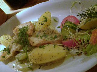 Acompañó a la perfección, por lo menos a mi pescado de agua dulce, el riesling básico, seco, de la casa Robert Weil, añada de 2005. Una insolación más alta de lo habitual en el Rheingau, con un septiembre también muy soleado, con las lluvias en su sitio, acabaron produciendo una cosecha muy sana. El trocken de esta añada tiene 12% y las botellas que abrimos empezaron más cerradas en nariz de lo que es habitual para esta cosecha. Tras un buen rato empezó a abrirse el vino y a mostrar sus frutas maduras, pera y melocotón, primero, delicado orejón de albaricoque, después. Con unos hidrocarburos absolutamente bajo control (muy moderados), acabó con notas de moscatel y con una buena presencia en boca, aunque no muy larga. El único "pero" es, sin duda, el del precio: si mis notas son correctas, cada botella costó 26 euros. Este detalle ya os da una idea de por dónde va el asunto del vino en Berlin.
