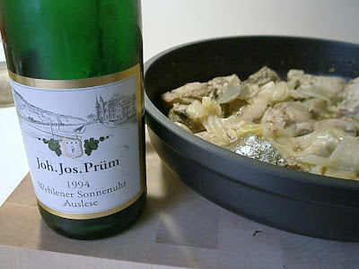 Este 1994 se ofrece con 7,5%, conviene ser decantado por lo menos 4 horas antes del servicio y éste tiene que rondar los 10-11ºC. Fue uno de los vinos que elegí para la primera cena con amigos en la nueva casa y los amantes de la riesling ya sabéis por qué: una de las grandes bodegas de Mosel-Saar-Ruwer, con uno de sus grandes vinos para una receta sencilla pero de combinación muy resultona. Amarillo limón bastante maduro pero con trazos aún de mínimo verdor, sus primeros aromas son los de esa mineralidad fosil (casi queroseno de avión, en este caso), tan propia del Mosela medio. Con la aireación en copa, este "perfume de la tierra" se ve arropado y completado por aires de albaricoque maduro (casi orejones: alguna uva botritizada habrá caído en la selección) y por caramelos de miel, melisa y limón. En boca es extraordinario, su punto mejor para mí: esa contundencia aromática inicial contrasta con un paladar ligero, casi de seda, liviano, de estructura clara y brillante, casi como agua pura del manantial, con una fabulosa perseverancia que remite, al final, a las hierbas medicinales de monte (esos caramelos que los chinos intentaron birlar a loa suizos, vaya). El frescor de este 94, el suave dulzor del Auslese corregido y atemperado por los años de guarda casaron de maravilla con unos tacos de atún ligeramente escabechados: en la cazuela va directamente la disolución de agua y vinagre de Jerez, con tomillo y laurel (algo de vino debería de ir también, pero en esta ocasión, lo ahorramos) y la cebolla cruda, sin más: todo el protagonismo para Prüm. Cuando ha reducido la vinagreta y la cebolla anda ya transparente, se añaden los tacos de atún, sin enharinar, se salpimientan (pusimos unas bayas de pimienta roja también) y se dejan cocer lentamente. El escabeche tiene que reposar por lo menos 8-10 horas (al día siguiente, mejor), pero no tiene que comerse frío, sino a temperatura ambiente. Con el Prüm 94 a su buena temperatura casi os digo ¡que me pongo a hacer otra mudanza para celebrarla de nuevo!